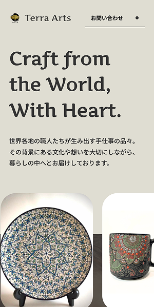 民芸品の文化的背景や作り手の想いが伝わるよう、写真と文章の構成から設計し、トップページには印象的なアニメーションを用いて世界観を表現。