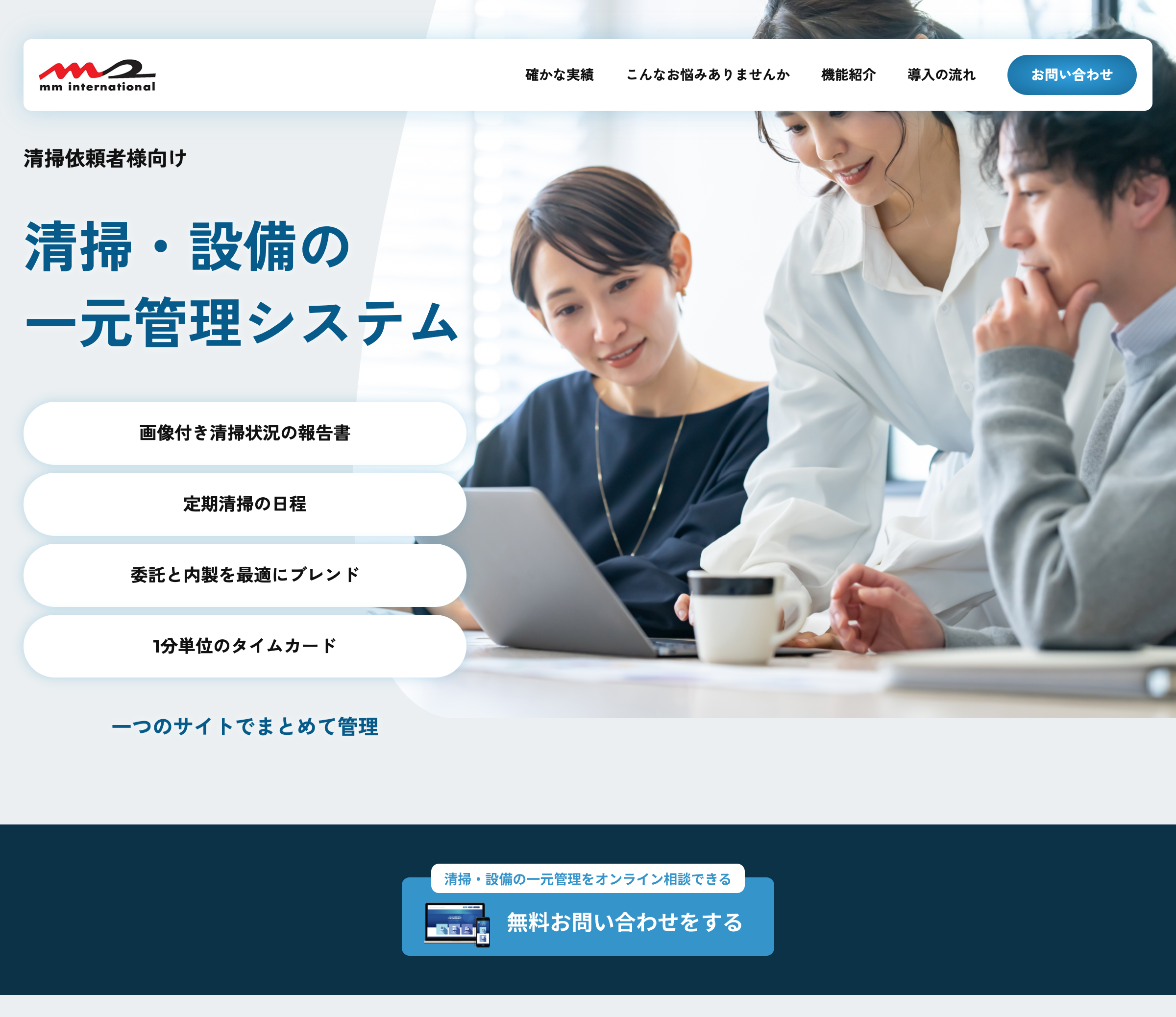 株式会社MMインターナショナル様のコーポレートサイト内の事業紹介ページとして、清掃・設備保守を一括管理できるミニLPをWordPressで構築しました。