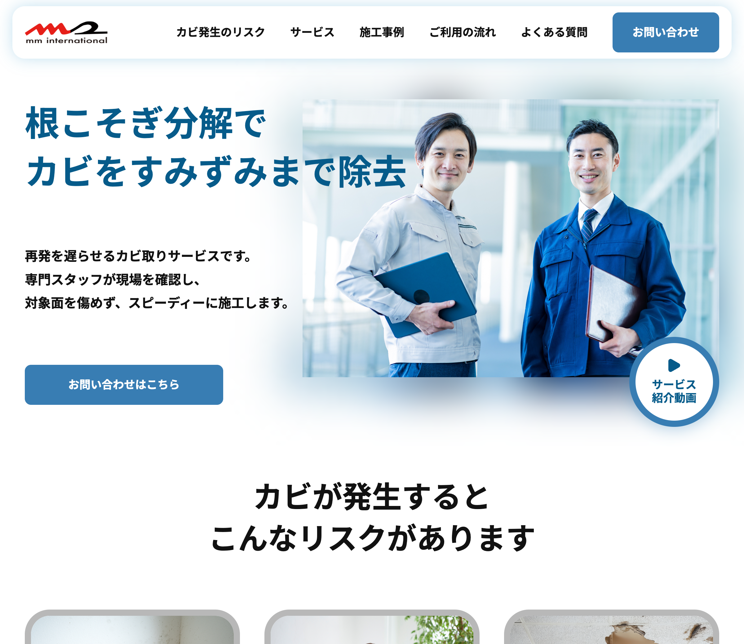 カビを根本から分解し、再発を遅らせるという専門性を、スクロール型LPとして直感的に伝える構成です。冒頭にインパクトのあるキャッチコピーと施工前後のビジュアルを配置し、「見た目・衛生・健康・建物劣化」などリスクの多角的な訴求も明確に整理しました。
